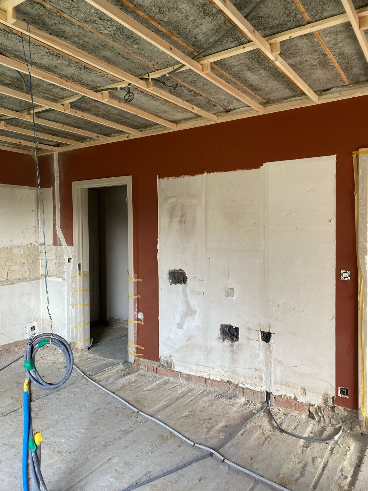 Bij project G. nemen we de benedenverdieping onder handen. Het huidige interieur is aan vervanging toe, en daar brengen wij graag verandering in! We gaan werken met vloerverwarming, een nieuwe vloer, een nieuw plafond, nieuwe verlichting, een moderne maatwerkkeuken en living, ... Alles er op en er aan!